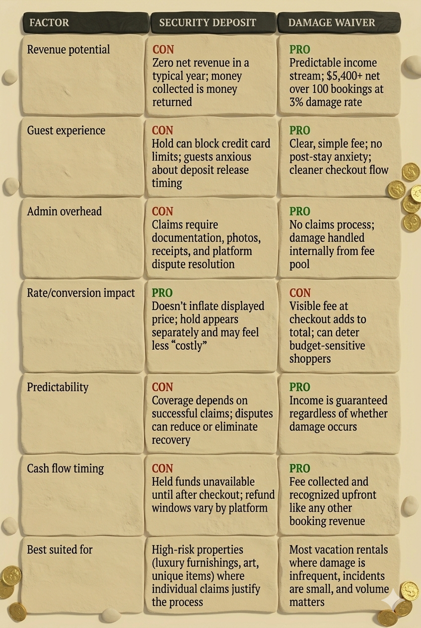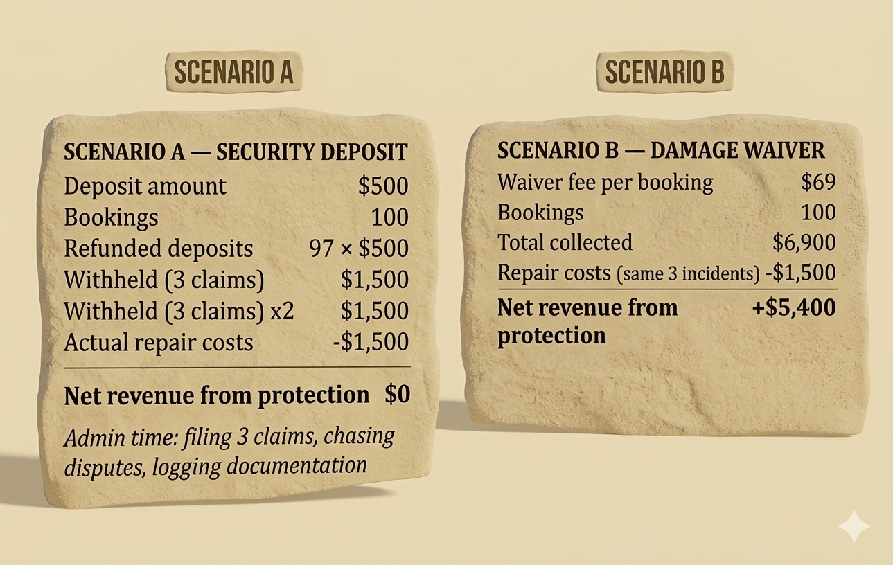 The deposit feels more powerful because the dollar amount is bigger. But a held amount that you're obligated to return isn't income — it's a service you're providing for free. Some may still see security deposits as a better safety blanket and there is absolutely still a time and place for taking deposits. But the waiver turns your protection policy into a profit center. That's not a small distinction. Over five years and five hundred bookings, it's the difference between a cost center and a meaningful revenue line.
